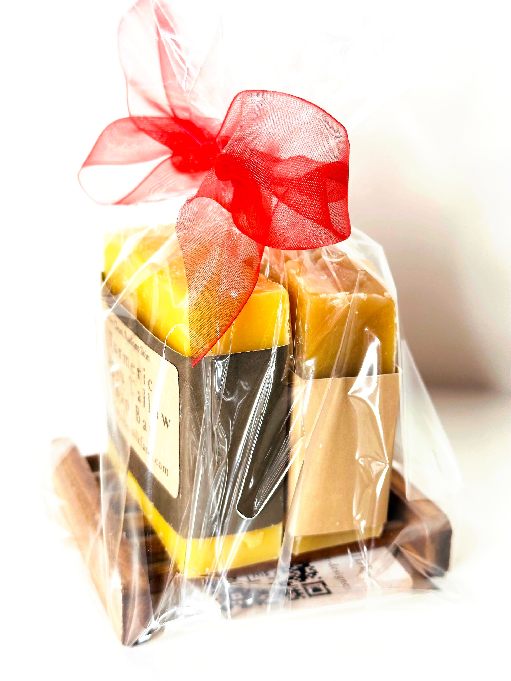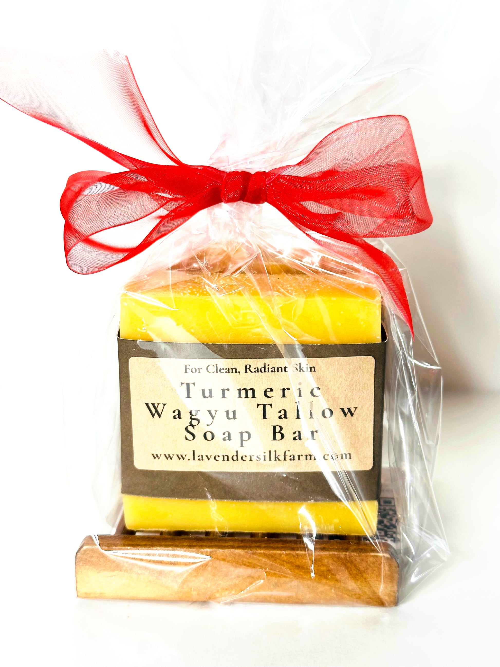 Turmeric Wagyu Tallow Soap - Packed with naturally occurring curcumin, turmeric has been used for centuries to brighten the complexion and support calm, balanced skin. Combined with Wagyu Tallow- rich in oleic, stearic, and palmitic acids-this bar helps lock in moisture and leaves skin feeling restored instead of stripped.